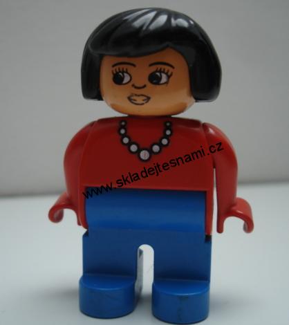 DUPLO HRANÁ FIGURKA V DOBRÉM STAVU, MAMINKA, ČERNÉ VLASY, ČERVENÝ SVETR, NA KRKU KORÁLE, MODRÉ KALHOTY.